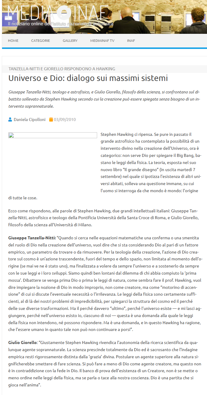 «Non è niente di nuovo. Sta emergendo negli ultimi tempi, soprattutto nel campo di una certa fisica teorica che va aldilà di ciò che è testabile in laboratorio, un filone di studi che porta alla concezione dei “multiversi”, cioè che esistono una molteplicità infinita di universi. E noi vivremmo in una di queste realtà, con le sue leggi e le sue costanti, ma pur sempre una bolla delle infinite possibili che si creano. Questo farebbe fuori il problema della creazione. Per noi che siamo degli sperimentali dell’astrofisica sono delle curiosità, magari ne parli durante il caffè. Ma poi non hanno impatto sulla ricerca che facciamo. E poi tornare a parlare di infinitezza è contro le ormai assodate scoperte della fisica. La mia prima reazione alle parole di Hawking è stata: “Ci risiamo”. Ci sono dei fisici, Hawking è uno dei campioni ma non l’unico, che spingendosi su questi terreni fanno cattiva fisica, perché dicono cose non testabili. Ma al contempo cattiva metafisica, cattiva filosofia. Contro la ragione. Perché che l’“essere” scaturisca da se stesso, o dal nulla. Ma il nulla come può produrre qualcosa? Questo produce nell’opinione pubblica l’immagine di una scienza radicale, scientista. Ed è un male per la scienza stessa. Per l’uomo evoluto, Dio è qualcosa di più del primo motore, del creatore dell’universo. Lui lo fa diventare una macchietta da età del bronzo. Quello che afferma non è provabile. E non essendo provabile, misurabile e negabile non appartiene alla fisica. È una affermazione che deriva da una visione, un atteggiamento culturale, una storia personale. Ma il fatto che venga detta da un fisico le dà una autorità che non ha. Cose di questo tipo sono speculazioni, idee. Non fanno parte dell’ambito scientifico. Il Physical Journal non pubblicherà mai una cosa del genere. Non è provabile, non è negabile. Non è nulla. Una rispettabile opinione. Nulla più»4M. Robberto, Euresis, 03/09/2010.