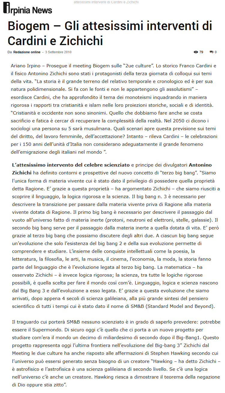 «Hawking è astrofisico e l’astrofisica è una scienza galileiana di secondo livello. Se c’è una logica nell’universo c’è anche un Creatore. Hawking riesca a dimostrare il teorema della negazione di Dio oppure stia zitto»9A. Zichichi, Irpinia News, 3/9/10