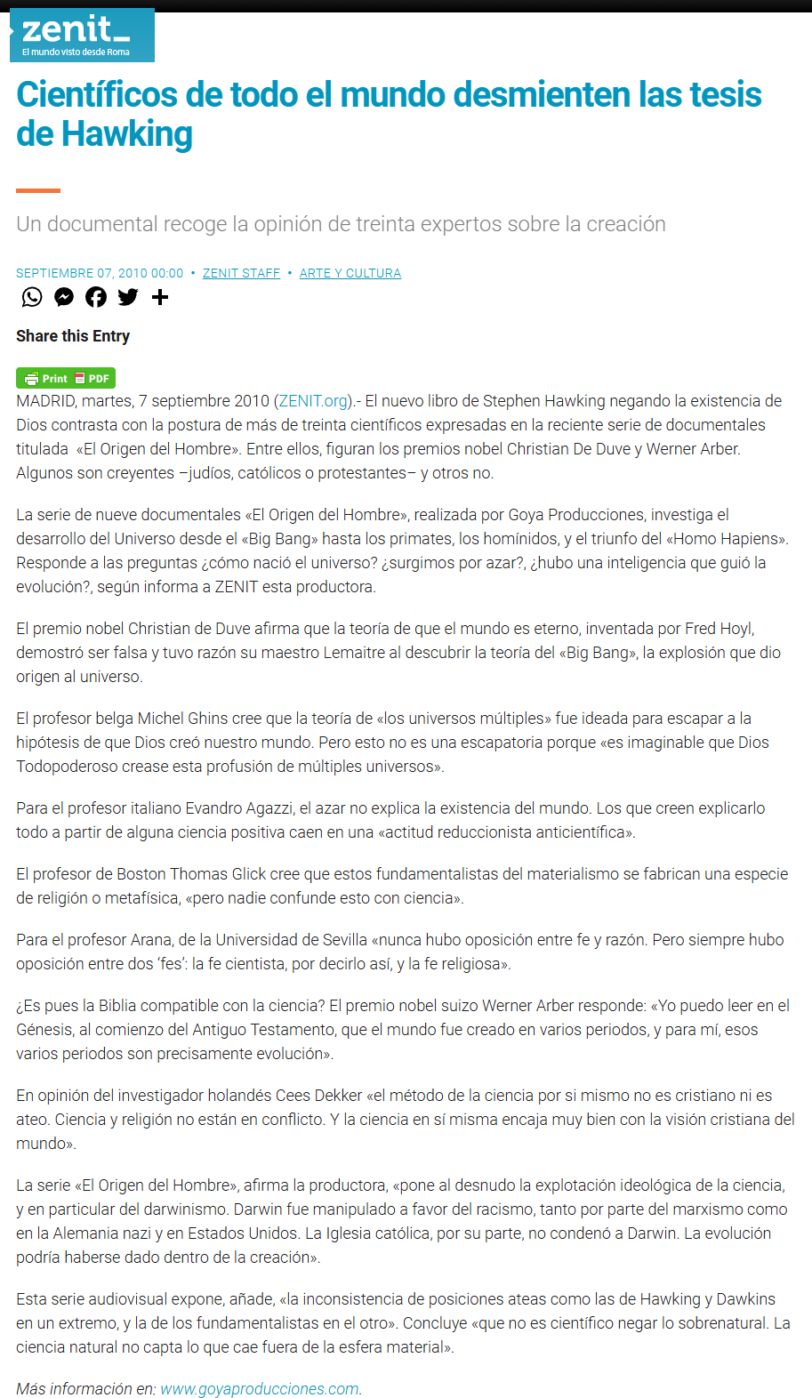 «Il metodo della scienza in sé non è né cristiano né ateo. Scienza e religione non sono in conflitto. E la scienza stessa si adatta molto bene alla visione cristiana del mondo»12C. Dekker, Zenit.es, 07/09/2010.