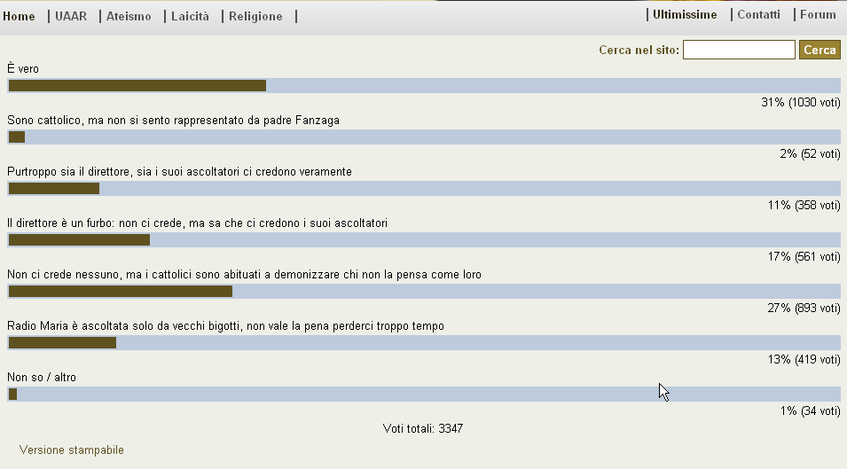 3) Dispetto cattolico. La terza ipotesi, la meno probabile, è che la maggioranza dei votanti sia cattolica e la pensi esattamente come Padre Livio. Pare assai improbabile però, perché sarebbe come postulare che la maggioranza di coloro che partecipano ai sondaggi che appaiono sul quotidiano La Repubblica siano militanti di Forza Nuova. Se fosse vero, dimostrerebbe comunque -anche in questo caso- la poca attenzione degli estremisti atei ai sondaggi loro proposti e indicherebbe che -anche nel sito degli atei italiani-, i visitatori più attivi sono i cattolici. Comunque sia, l’UAAR ne esce male in tutti e tre i casi.