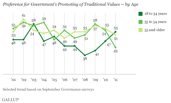 Un recente sondaggio Gallup (8-11 settembre 2011) ha documentato un’impennata di giovani americani dai 18 ai 34 anni che desidera che il governo debba promuovere i “valori tradizionali”. Una cosa simile si è verificata in un sondaggio realizzato recentemente in Francia (cfr. Ultimissima 10/10/11)