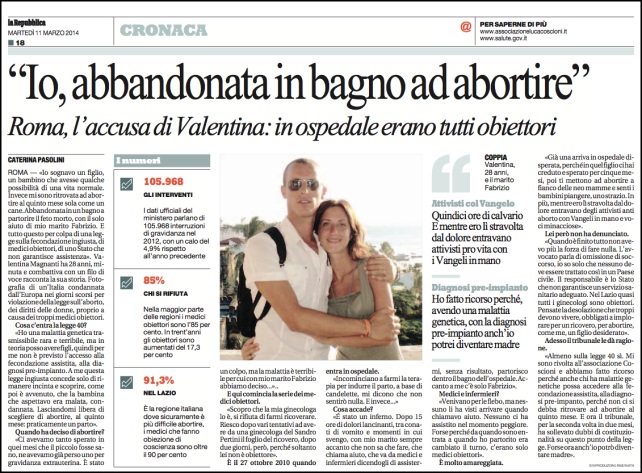 “Costretta ad abortire in bagno da sola. In ospedale soltanto medici obiettori”. Tiene banco questa storia sui principali quotidiani, promossa dall’Associazione Luca Coscioni, braccio giuridico del Partito Radicale guidato da Filomena Gallo.