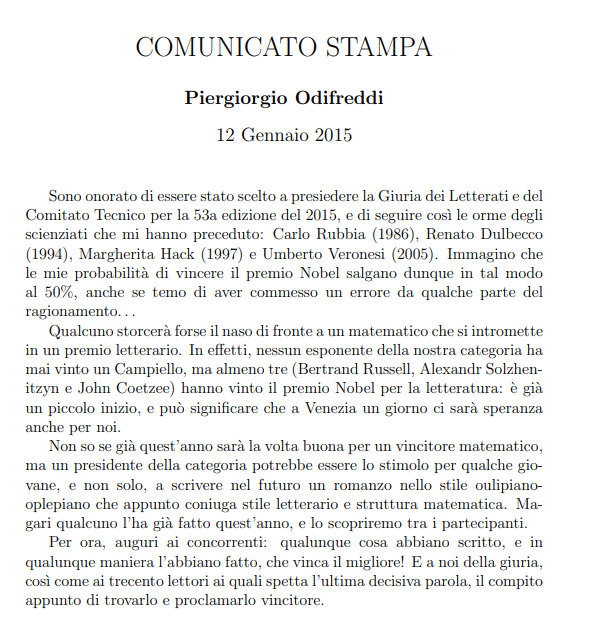 Eppure pochi giorni fa, appena saputo di essere nominato tra i candidabili, aveva addirittura diffuso un comunicato stampa di gioia per la notizia: «Sono onorato di essere stato scelto a presiedere la Giuria dei Letterati […]. Non so se già quest’anno sarà la volta buona per un vincitore matematico, ma un presidente della categoria potrebbe essere lo stimolo per qualche giovane».