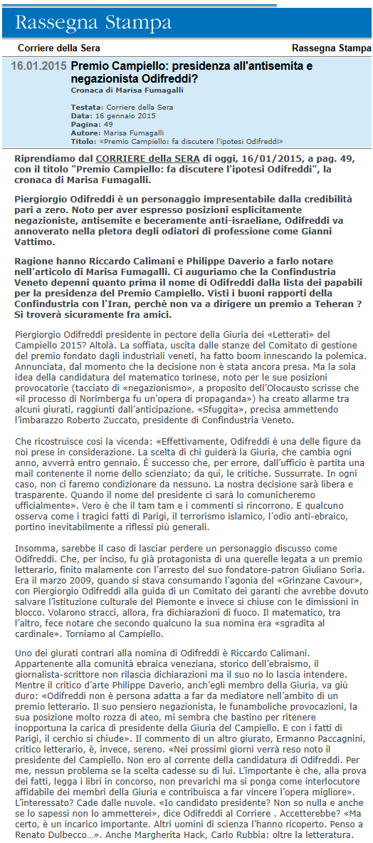Gli altri giurati hanno sollevato la questione dell’antisemitismo e del negazionismo di Odifreddi, dicendosi indignati della sua nomina.