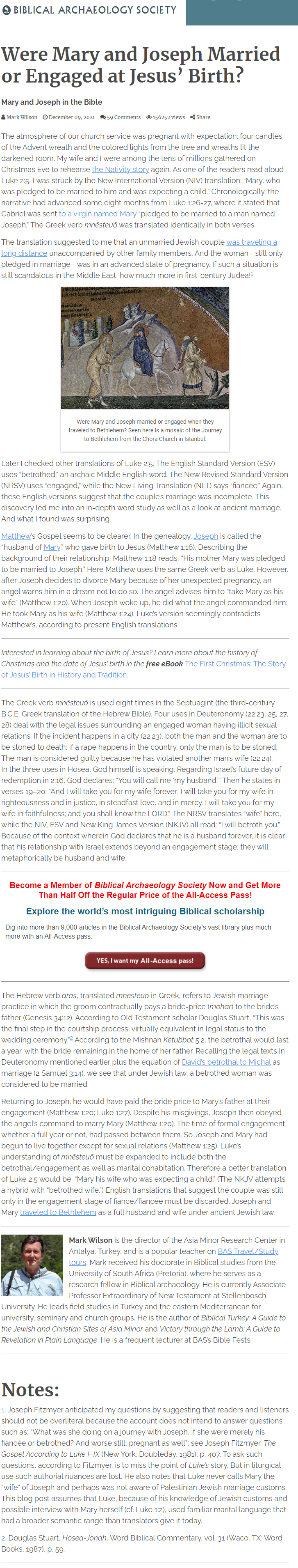 La cosa è piuttosto problematica: Maria, nel fare il viaggio con Giuseppe verso Betlemme per il censimento, non sarebbe ancora legittima sposa di Giuseppe, ma semplicemente fidanzata con lui.