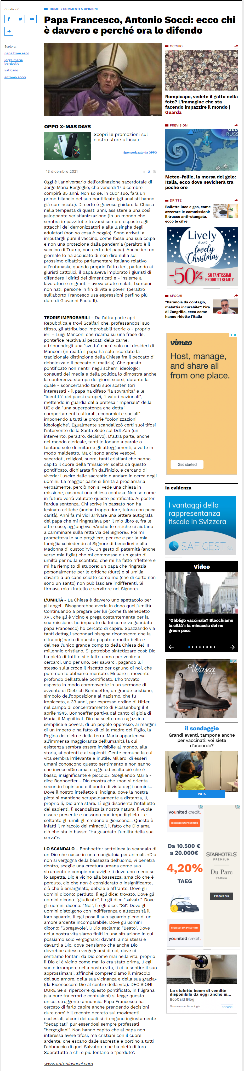 Il 13 dicembre 2021 il giornalista Antonio Socci ha scritto un articolo di scuse per i suoi attacchi e di “conversione”, riconoscendosi nel pontificato di Francesco e ammettendo: «Anche ieri un giornale lo ha accusato di non dire nulla sul prossimo dibattito parlamentare italiano relativo all’eutanasia, quando proprio l’altro ieri, parlando ai giuristi cattolici, il papa aveva implorato i giuristi di difendere i diritti dei dimenticati e – insieme a lavoratori e migranti – aveva citato malati, bambini non nati, persone in fin di vita e poveri».