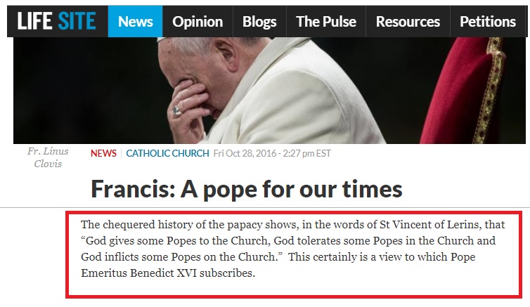 «Alcuni papi Dio li dona, altri li tollera, altri ancora li infligge». Questa la frase attribuita a San Vincenzo di Lerino e popolare tra i vari blog e autori antipapisti, dedicata ovviamente a Papa Francesco e diffusa in particolare da Antonio Socci che la riportò anche nel suo libro Non è Francesco. Addirittura, su LifeSiteNews, Don Linus Clovis, dopo aver citato la frase in questione, ha aggiunto: «Questa è sicuramente un’opinione che Benedetto XVI sottoscrive».