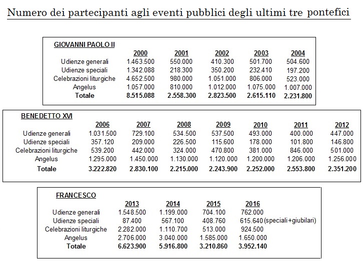 Il 07 gennaio 2017 sul nostro sito web è apparsa una piccola inchiesta che ha mostrato che Francesco non ha subito alcun crollo di fedeli ma, anzi, la media dei partecipanti ai suoi eventi pubblici è stata ben superiore a quella dei suoi predecessori. Senza che ovviamente questo voglia dire nulla sulla verità o falsità di un pontificato, come invece sostengono i suoi critici.