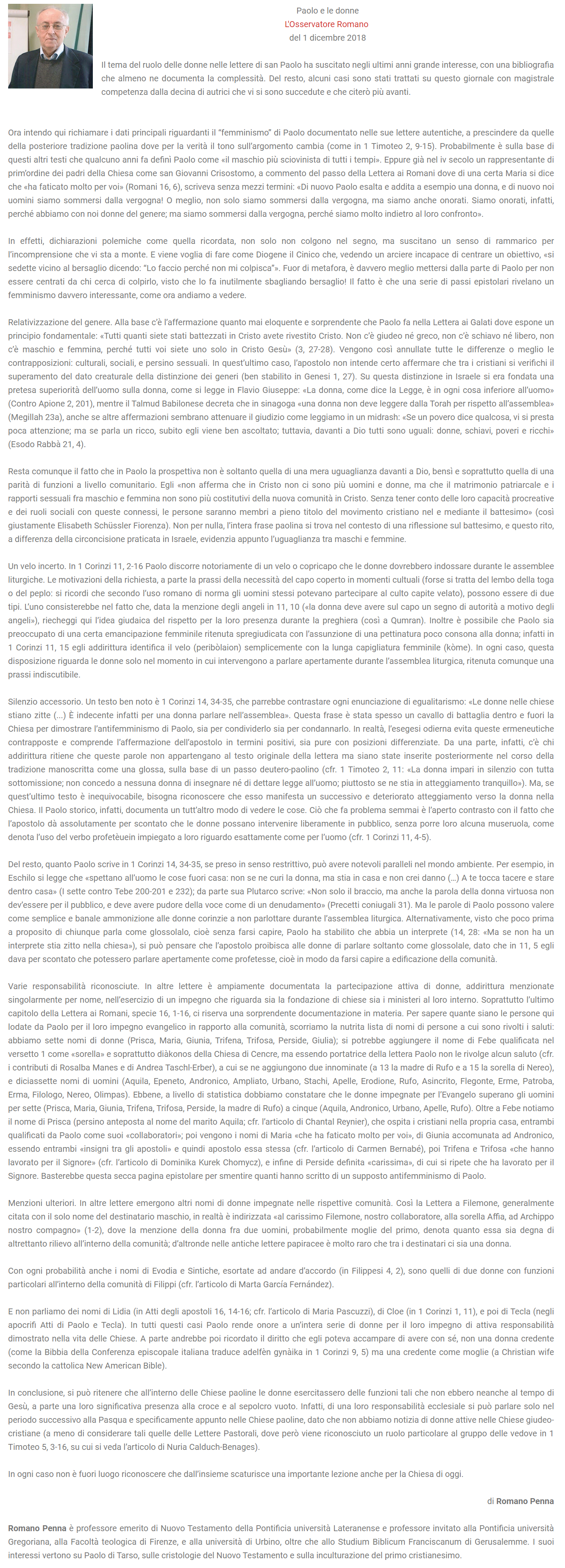 Romano Penna spiega che l’apostolo delle genti, nei suoi testi, «dà assolutamente per scontato che le donne possano intervenire liberamente in pubblico, senza porre loro alcuna museruola, come denota l’uso del verbo profetèuein impiegato a loro riguardo esattamente come per l’uomo».