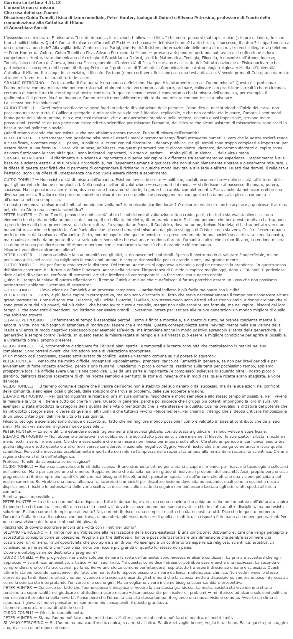 Qual è l’unità di misura dell’umanità? E chi — o che cosa — definisce l’uomo? Su questo si sono confrontati il frate domenicano Peter Hunter, docente al collegio di Blackfriars a Oxford, il fisico Guido Tonelli, docente alla Normale di Pisa e l’antropologo Silvano Petrosino dell’Università Cattolica di Milano. Ci mancherebbe, qualche spunto interessante è emerso: «spesso ci convinciamo che la misura dell’uomo sia, per esempio, il godimento. O il potere. Ma è un inganno», ha introdotto Petrosino, «l’uomo resta irrimediabilmente abitato da una misura che non riesce a misurare». Nonostante il promettente inizio, la conversazione si è rivelata sterile anzi, controproducente, almeno quando Tonelli ha affermato che bisogna «capire che il valore dell’uomo non è stabilito dal suo denaro o dal successo, ma dalle sue azioni nei confronti delle comunità, siano esse locali o globali, dalle soluzioni che trova ai problemi, dalle sue scoperte e visioni».