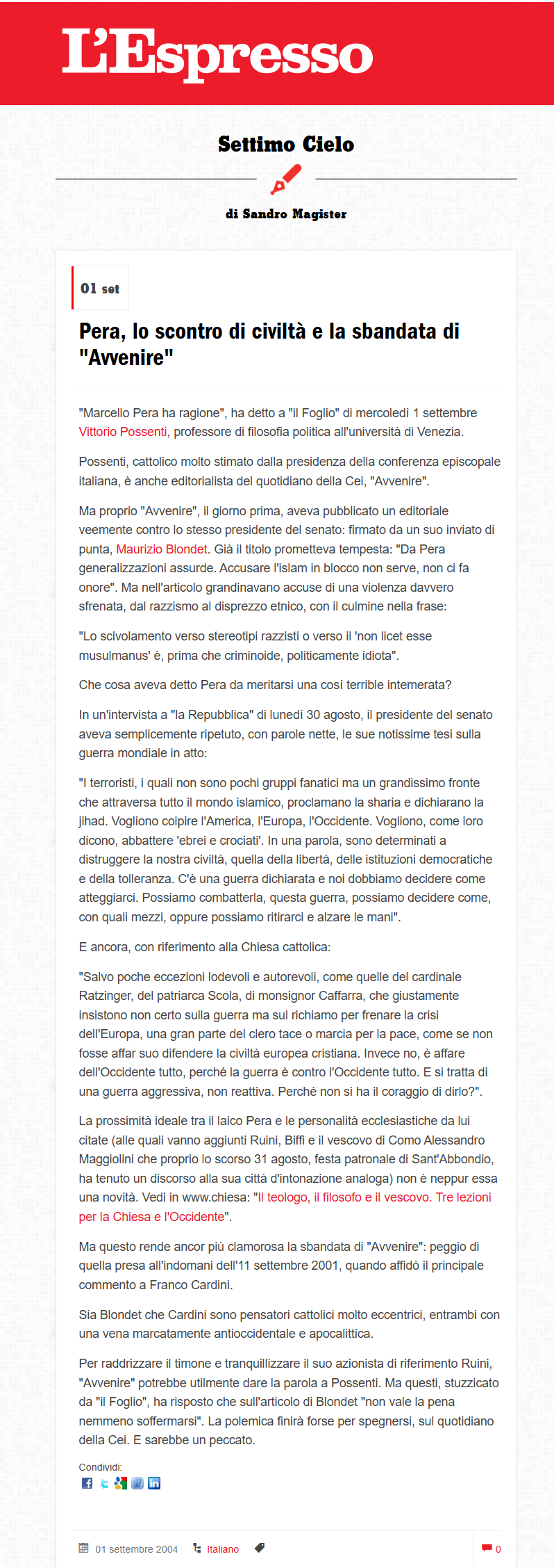 «E’ semplicistica e per un certo verso eccessiva la reazione che prende di mira l’Islam in genere e non solo il fondamentalismo islamico, concentrandosi in particolare sul pericolo rappresentato dall’immigrazione islamica. Ad ogni modo la Chiesa non può non rifarsi alla sostanza del messaggio cristiano. Deve quindi richiamare innanzitutto l’universale fraternità umana per la quale, ne siamo o meno consapevoli, siamo tutti figli di un unico Padre. Deve però al tempo stesso dire chiaramente che Gesù Cristo è, per tutti, l’unico salvatore».