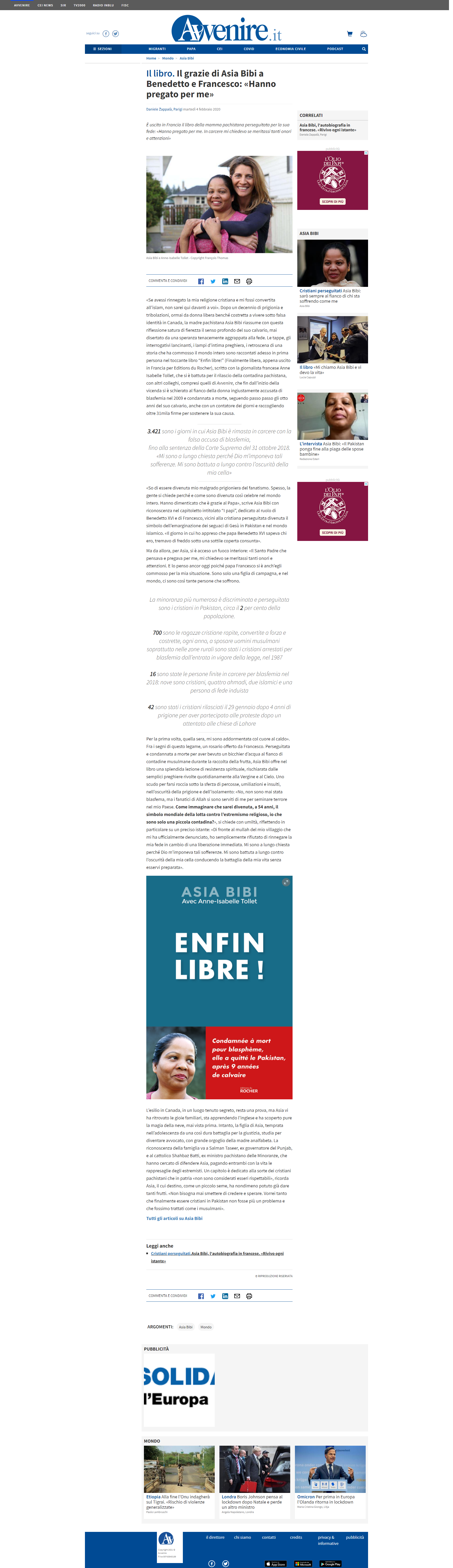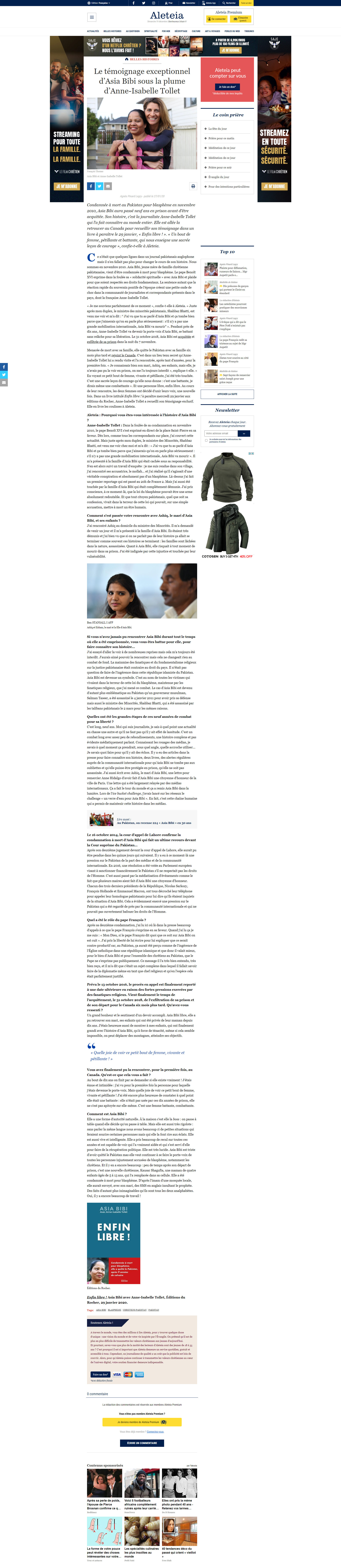 La giornalista francese Anne-Isabelle Tollet si è battuta per anni sulla liberazione di Asia Bibi e nel 2020 la donna pakistana ha scritto assieme a lei la sua biografia. Tollet ha affermato rispetto al ruolo di Papa Francesco: