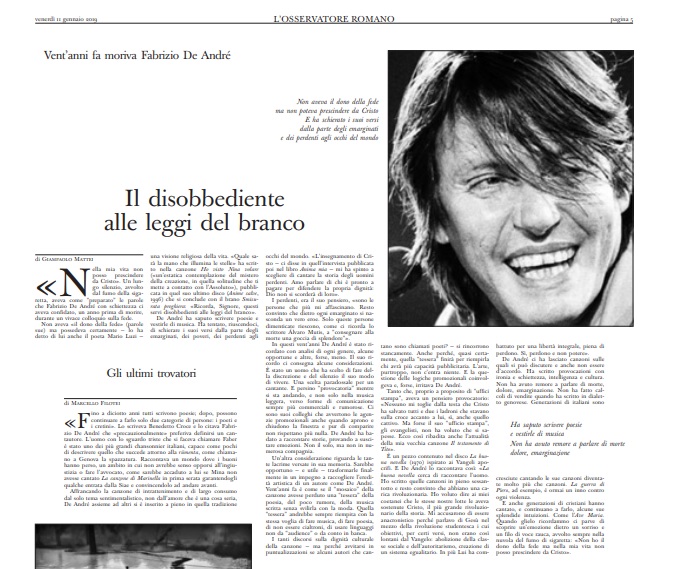 Bello constatare che, nell’edizione odierna, l’Osservatore Romano è tornato a produrre cultura, pubblicando proprio una commemorazione di De Andé da parte di Mattei.