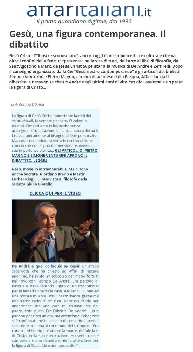 Il giornalista riscopre alcuni brani “evangelici” di Faber, dove la figura di Cristo è centrale, l’attenzione è in particolare rivolta al suo ultimo album Anime salve (1996).