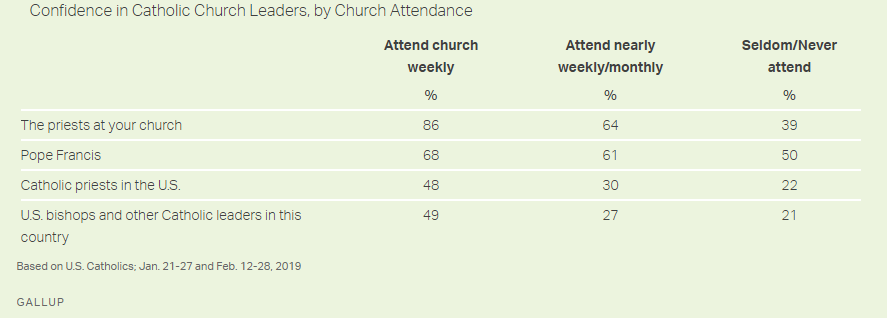 c’è una differenza fondamentale tra il condividere le idee di una persona e avere fiducia in essa, e il sondaggio chiede la prima cosa, non la seconda: devi tenere conto che i vescovi usa hanno perso la fiducia del popolo anche per una gestione degli abusi pessima, e hanno subito il fuoco della stampa mainstream che non ha avuto pietà di loro