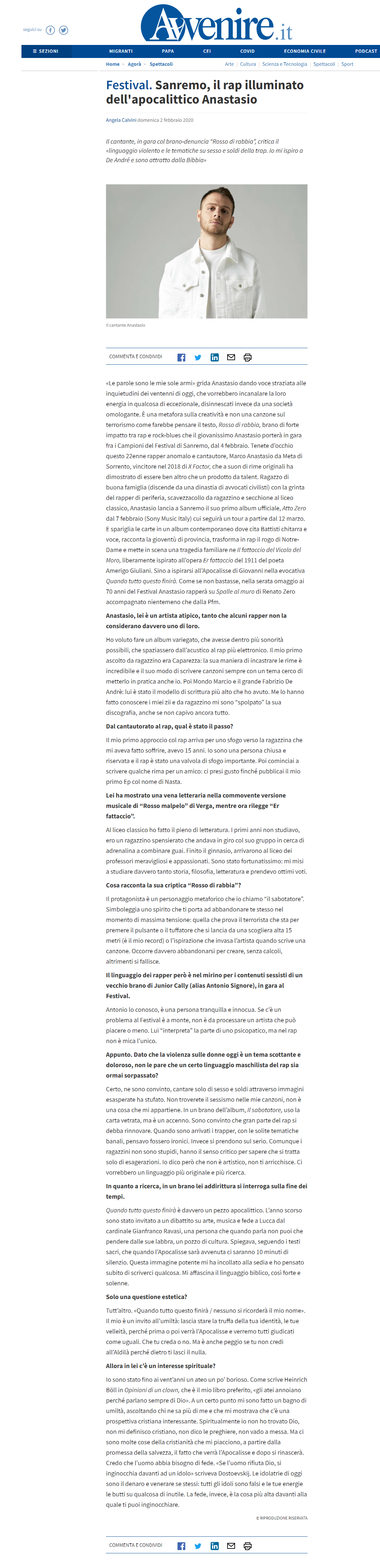 Vincitore di X-Factor nel 2018, il rapper Anastasio ha qualcosa di interessante da dire. Una profondità inedita nel panorama musicale giovanile. Scettico fino ai 20 anni, oggi porta nelle radio temi evangelici, la salvezza e la necessità della fede, per non piegarsi agli idoli.