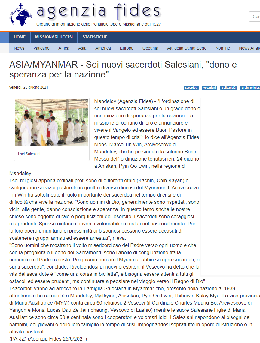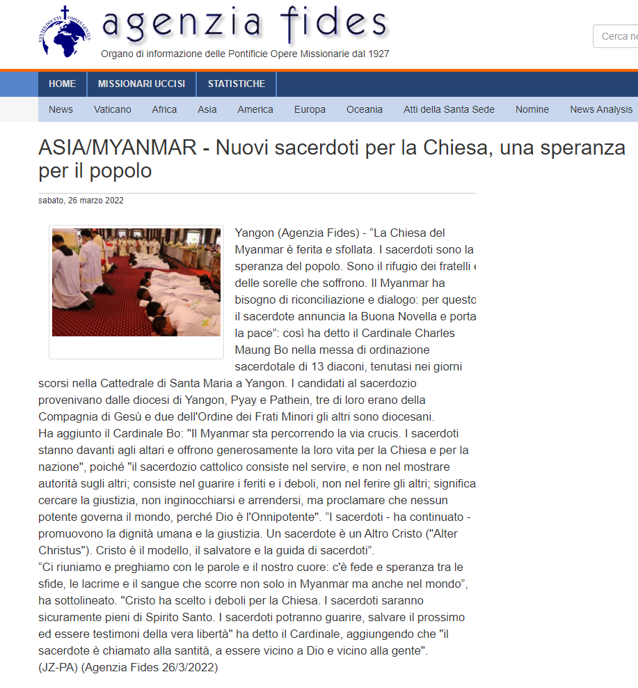 «La Chiesa in Myanmar è ferita e sfollata. I sacerdoti sono la speranza del popolo», ha detto il cardinale. «Essi sono il rifugio dei fratelli e delle sorelle che soffrono, speranza in mezzo a lacrime e sangue».