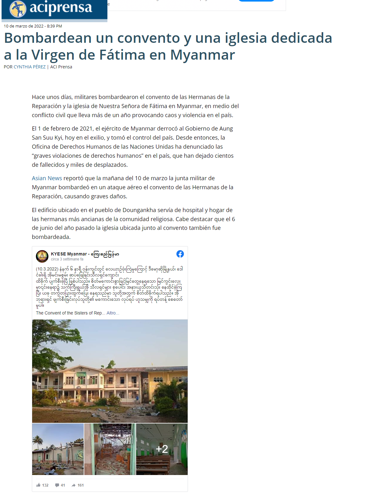 L’ultimo ad essere attaccato dalle autorità è stato il convento di suore nella cittadina di Doungankha. L’attacco è avvenuto appena tre giorni dopo che l’esercito ha bombardato la chiesa di Nostra Signora di Fatima, situata nel villaggio di Saun Du La.