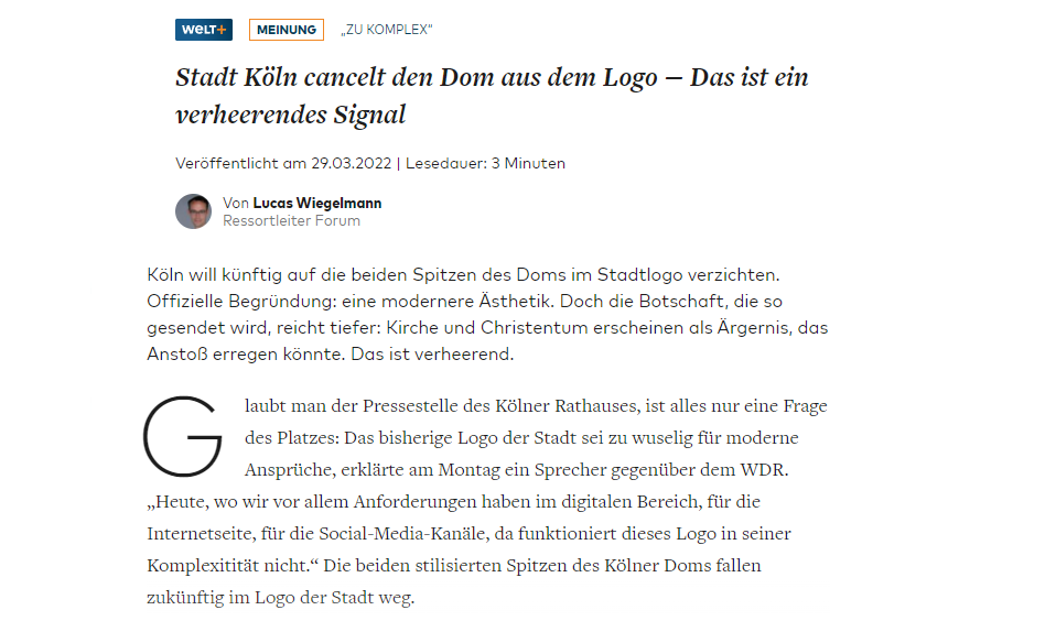 Un altro opinionista, Lucas Wiegelmann, è più arrabbiato: «In futuro Colonia vorrà fare a meno delle due guglie della cattedrale nel logo della città. Motivo ufficiale: un’estetica più moderna. Ma il messaggio che viene inviato va più in profondità: Chiesa e cristianesimo appaiono come un fastidio che potrebbe offendere. Questo è devastante».