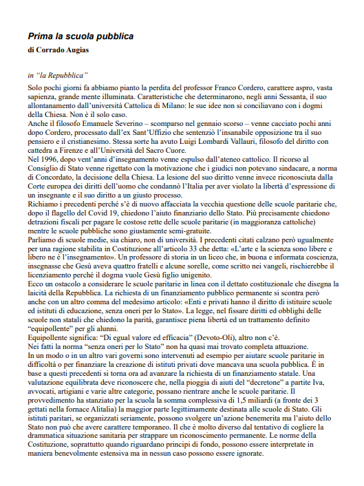 Innanzitutto, già il titolo dell’articolo di Augias è tutto un programma: “Prima la scuola pubblica”.