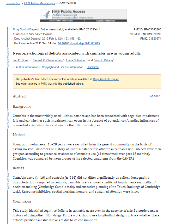Oltre ad essere stato esplicitamente smentito da uno studio pubblicato nel 2019, questa affermazione è direttamente contrastata da quanto scrivono i ricercatori: «Sono stati notati disturbi cognitivi anche nei consumatori lievi di cannabis: essi tendono a prendere decisioni più rischiose di altri e hanno più problemi con la pianificazione».