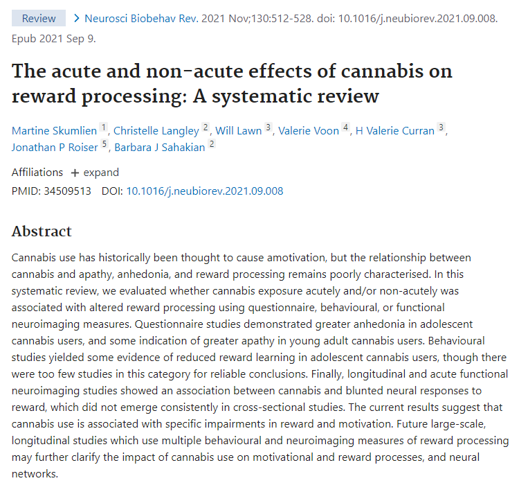 Nel 2021 su Neuroscience & Biobehavioral Reviews è stato certificato che l’uso di cannabis è anche associato a specifiche menomazioni nella ricompensa e nella motivazione e «l’uso di cannabis durante l’adolescenza è stato segnalato come un fattore di rischio per lo sviluppo di esperienze psicotiche e schizofrenia».