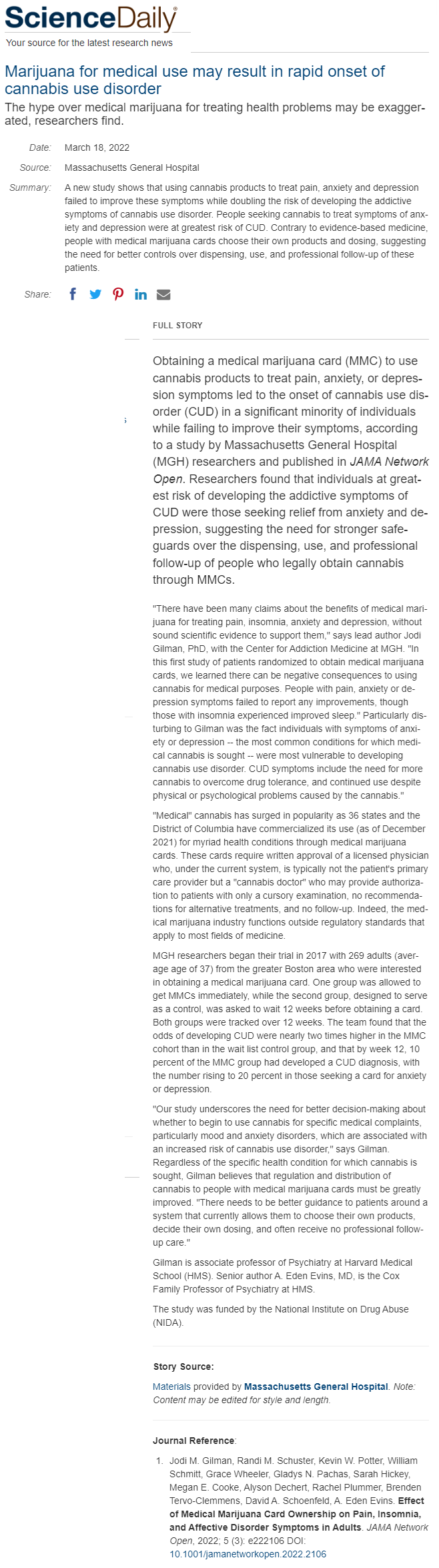 I ricercatori hanno scoperto che l’uso di prodotti a base di cannabis per trattare dolore, ansia e depressione non è riuscito a migliorare questi sintomi, raddoppiando invece il rischio di sviluppare i sintomi di dipendenza del disturbo da uso di cannabis.