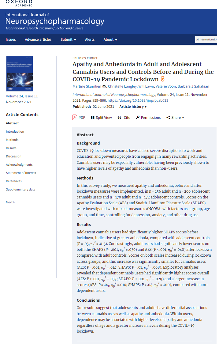 Il secondo studio, apparso su International Journal of Neuropsychopharmacology, ha dimostrato che l’uso di cannabis in adulti ed adolescenti è associato a dipendenza, apatia ed anedonia.