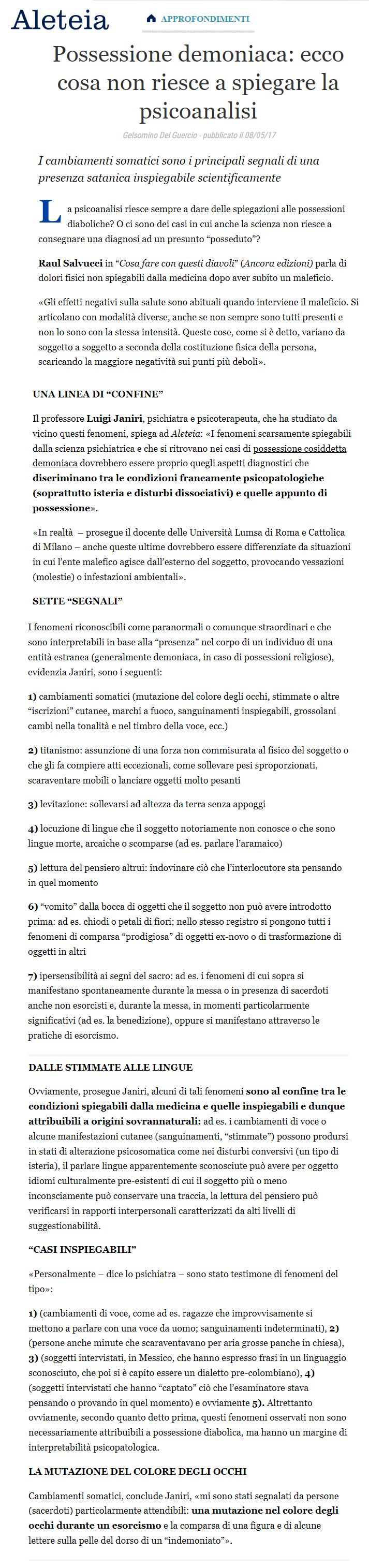 Avendo partecipato a numerosi esorcismi, Janiri elenca alcuni fenomeni di cui è stato testimone: cambi improvvisi di voce (ragazze che assumono voci maschili), improvvisi sanguinamenti, capacità di forza improvvisa (panche delle chiese scaraventate in aria), soggetti che parlano idiomi sconosciuti (in Messico un uomo ha usato un vocabolario pre-colombiano, lo si è scoperto in seguito).