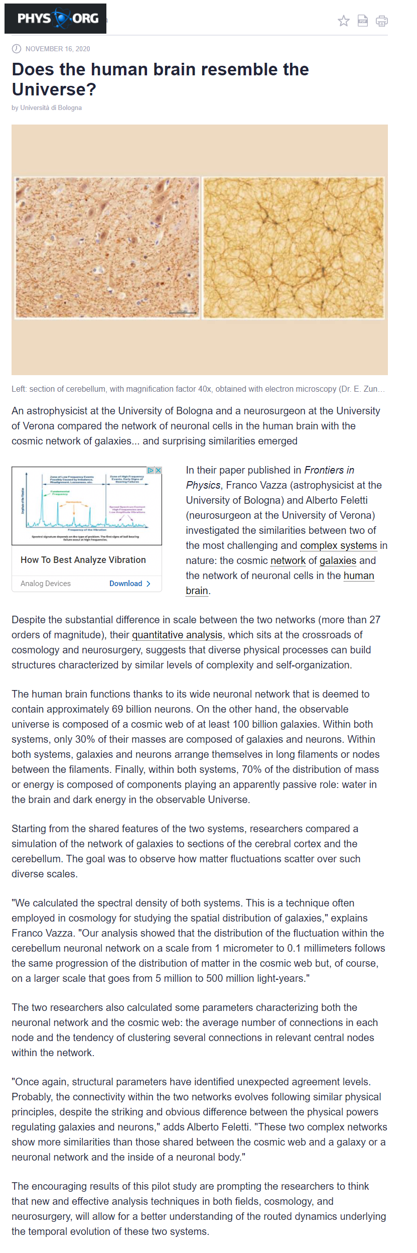 Anche se l’universo ha 27 ordini di grandezza in più di un singolo cervello umano, sono emerse notevoli somiglianze.