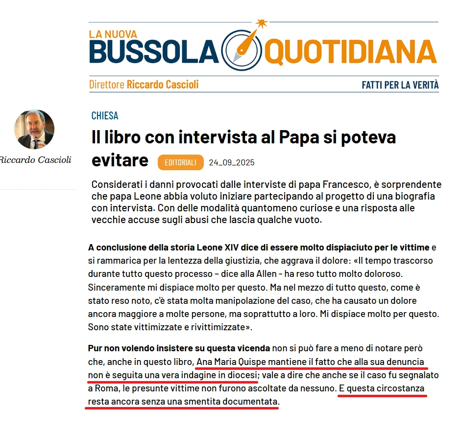 Non ancora sazio, nei giorni scorsi lo stesso Cascioli ha nuovamente attaccato Leone XIV avvalorando la versione delle vittime sulla mancata indagine diocesana: «Questa circostanza resta ancora senza una smentita documentata».