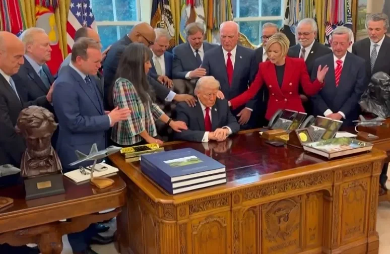 L’immagine ritrae il presidente Donald Trump seduto alla scrivania nello Studio ovale mentre un gruppo di leader evangelici gli impone le mani pregando su di lui in segno di benedizione.