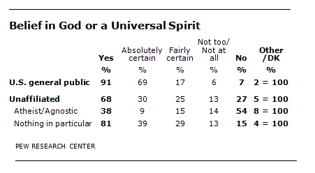 Per chi volesse approfondire consigliamo inoltre un’indagine del “Pew Research Center” sul 38% di atei e agnostici che crede in Dio (o in uno Spirito universale), di cui il 9% è assolutamente certo dell’esistenza. E quella, più recente, riguardante il 45% dei cosiddetti “nones” credenti.
