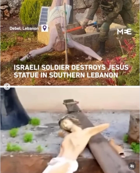 Sta facendo il giro del web l’immagine di un soldato delle forze armate israeliane che, nel sud del Libano, colpisce con una mazza una statua di Gesù già divelta dalla croce.