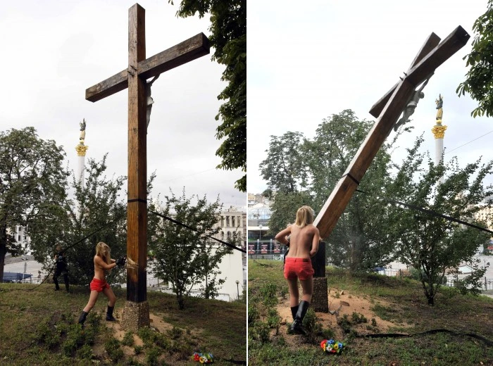 Forse ancora più nota fu l’iniziativa delle “Femen“, quando armate di motosega abbatterono la grande croce nel centro di Kiev dedicata alla memoria delle vittime dello stalinismo,